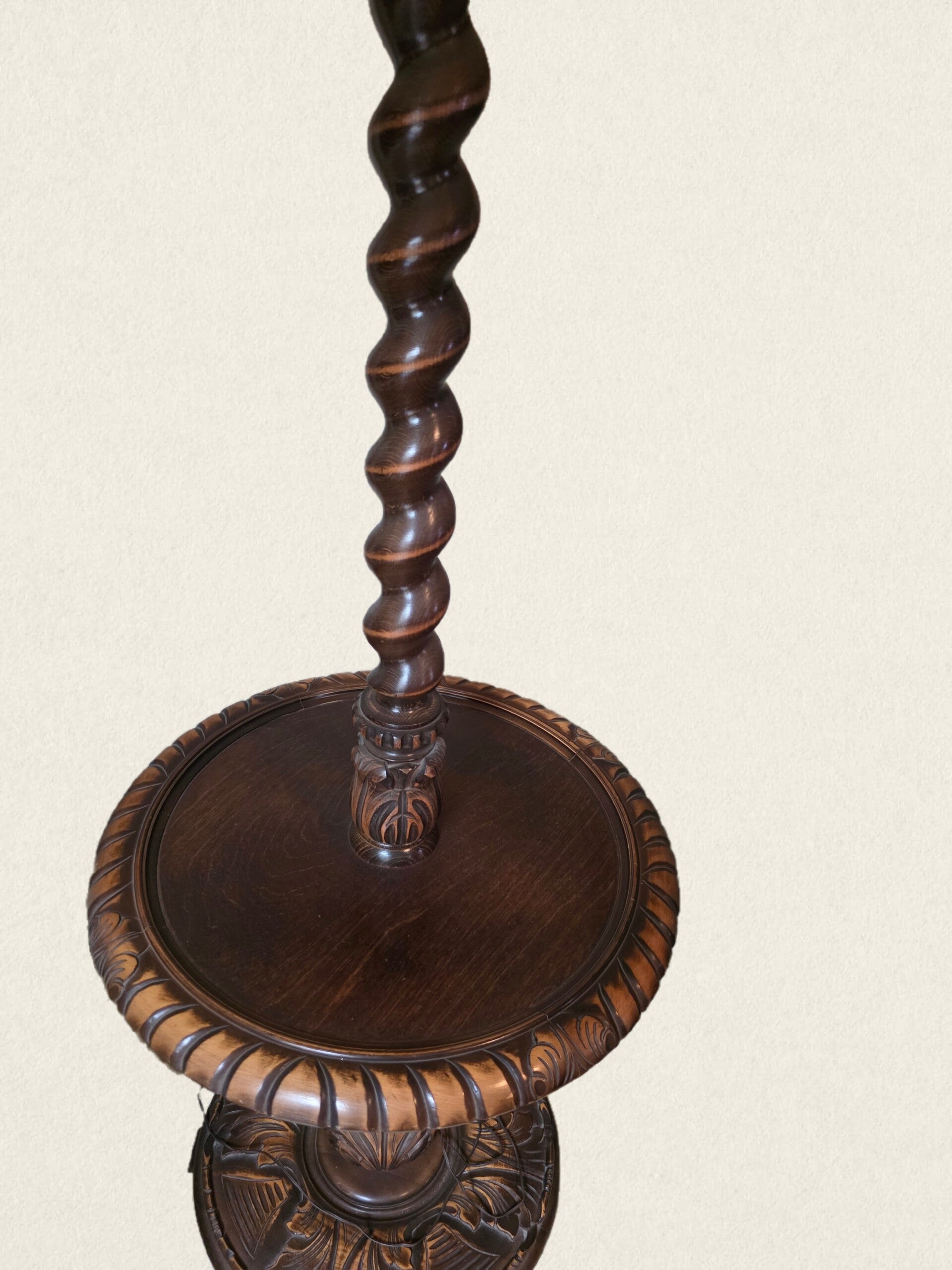 Unieke en stijlvolle vloerlamp met een prachtig bewerkte houten voet en geïntegreerd rond tafeltje. De lamp heeft een klassieke stoffen kap met sierlijke franjes, wat zorgt voor een warme en nostalgische uitstraling.